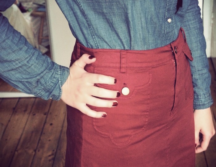 I am wearing a shirt c/o Levi’s, Louche skirt, Office shoes.