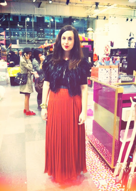 I am wearing: Skirt & feather bolero c/o Ted Baker, KG boots.