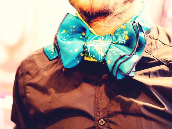 The first thing they made for me was a camera strap that I promptly replicated when I got home. I will make a little video tutorial to show you how to do it very soon. I was also shown how to make an oversized bow-tie and a bag. Mainly, I was handed the secrets of scarf knotting in the form of some “Cartes à Nouer” otherwise known as the knotting bible.