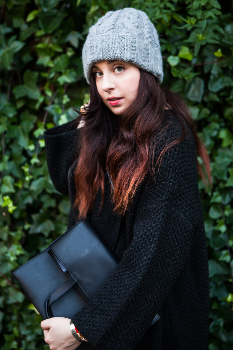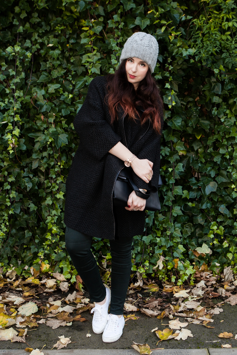I am wearing: J Brand “Brix” jeans c/o Matches, Vince cardigan, Acne tee-shirt, Eugenia Kim beanie, Maison Martin Margiela leather paper bag, Superga trainers (shop the look below)