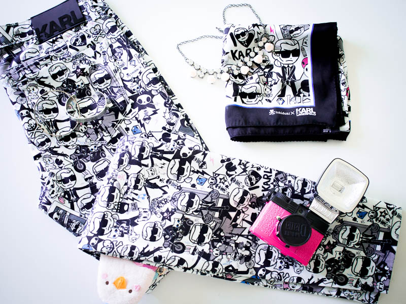Karl Lagerfeld is just like anyone, really. He got a kitten a while back, started a twitter account for her, rented her an extra apartment and feeds her prawns at every meal. He is so crazy cuckoo about his little Choupette that it made perfect sense for her to feature alongside his Majesty on a tokidoki doll, but also as a cute print on the whole collection. The tokidoki x Karl Lagerfeld capsule collection launched last week and is available exclusively at the Karl Lagerfeld concept stores in Berlin, Amsterdam and Paris, plus online on Net à Porter (because, where else?). The illustrations, designed in close collaboration between Simone Legno (creator of tokidoki) and Mr Karl himself are printed on a range of ready-to-wear apparel including tee-shirts, a skirt, a shirt, jeans, a scarf and many other fun items.