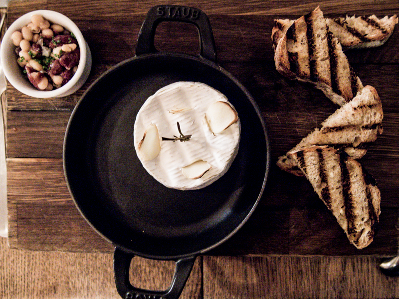 Baked English Camembert, Spring Bean Salad, Roast Shallot & Hazelnut Bread