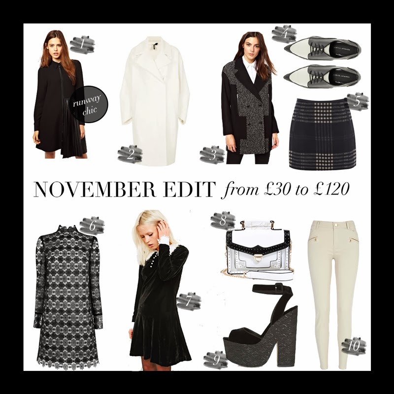 I’ve been wearing a lot of black recently with touches of white. Despite the appeal of the Winter pastels, I haven’t really been feeling very colourful so far this Autumn (pink coat aside). So for my November high-street edit, I thought I’d pick a selection all in black & white. Black doesn’t always have to be boring, just think about texture, fabrics and don’t forget the occasional white accent!