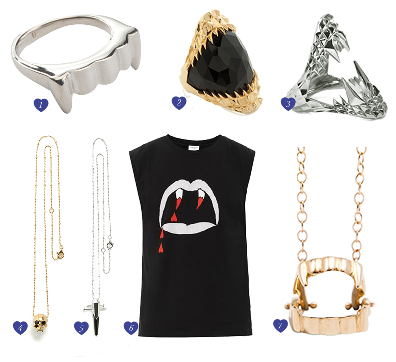 1 – Big Boy Vamp Ring, Bittersweets; 2 – Gold and Onyx Fangs Ring, Kasun; 3 – Silver Fangs Ring, Kasun; 4 – Gold Vampire Skull Necklace, Kasun; 5 – Silver and Onyx Stake Necklace, Kasun; 6 – Saint Laurent tank top – ; 7 – Baby Vamp Necklace, Bittersweets.