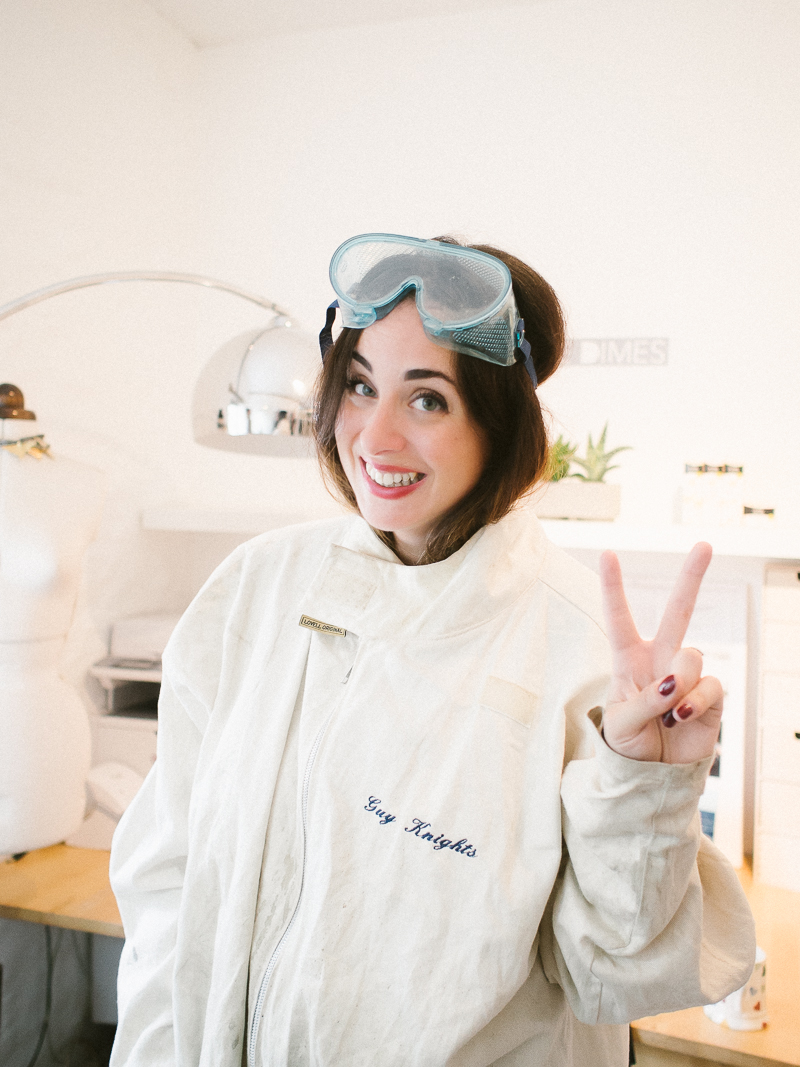 Totally embracing my new look wearing Daisy’s father’s smock and safety goggles.