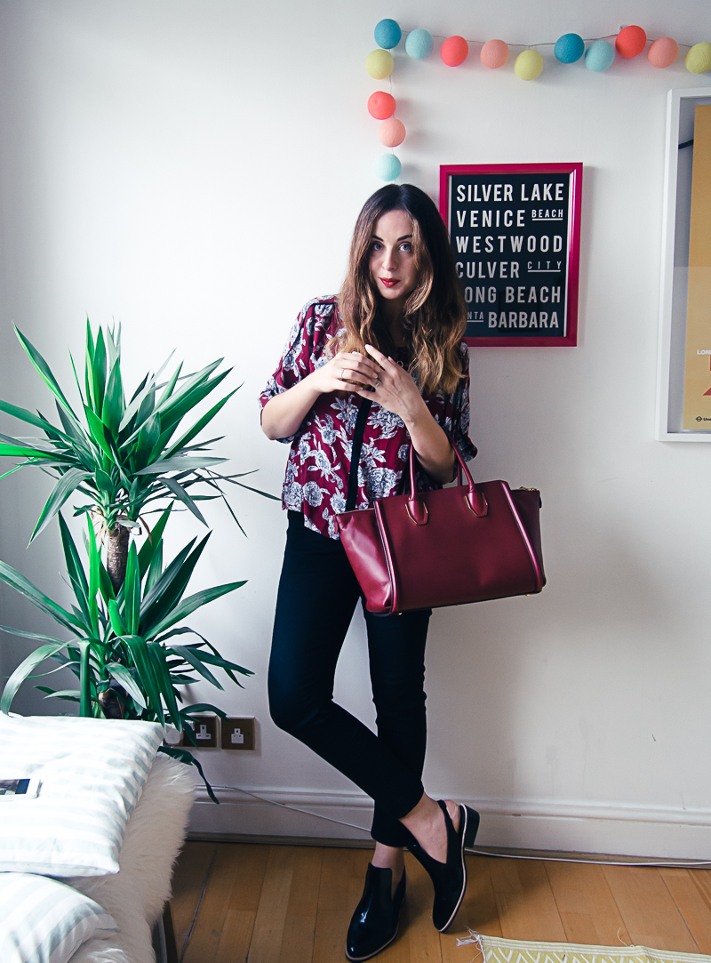 I logged in to Hulu last week and was greeted by a massive banner saying “FALL TV IS HERE“. This is the real barometer of the end of the Summer. Forget the dates and slow colour change of the leaves, it is all about the Fall TV schedule. And it is looking GOOD. When it comes to my wardrobe, that means… nothing. At the moment there is a status quo of sorts, because it is still pretty warm so I can’t yet live out my Captain Harlock fantasies in my oversized coat and super skinny jeans combo and also I seem to wear a whole lot of black come rain or come shine. To prove to myself I haven’t totally plunged into the heart of darkness, I figured I could add some colour to my current wardrobe and so I picked up this River Island top and MCM bag, both in a glorious shade of wine red, perfect for right now. This is only part one of my Autumnal Colours series as another few wine coloured bits and pieces have made their way in my closet recently.