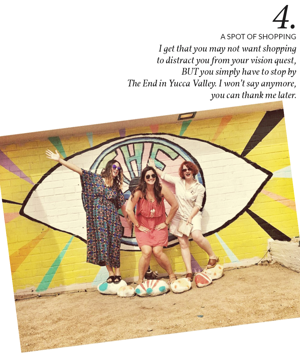 It is a classic feeling: you go somewhere for a week, and within that week you want to see everything, go on the craziest adventures, see the people you love and still have time to eat, sleep and have the occasional moment to yourself just to take it in and tattoo these memories on your cortex. I just got back from exactly that trip. We had so many plans, so little time. One morning, I hopped in a rather sassy looking rental with my two besties and we headed to the desert. We had each prepared a Spotify playlist filled with Car-aoke tunes and as we left Los Angeles around 7am we were ready to take on the world to the sound of The Ronettes, Katy Perry, Haim and other songs we screeched along to. The drive in itself is a memory I will forever cherish – that of being a fully grown woman shut in a metal box with two fully grown women, losing their s**t in perfect harmony. This wasn’t what I envisioned myself doing at 36, but it is way superior to all my hopes and dreams so far. I know, I need to get out more. We stopped to say hello to the dinosaurs in Cabazon, this weird and wonderful creationist museum that was memorialised in Pee Wee’s Big Adventure, and then we carried on our journey towards Palm Springs, to have a quick bite to eat with some friends on a romantic 4th of July weekend getaway. We also stopped to admire the mid-century houses and did a lot of driving around, taking photos of doors (which you will see in another post).