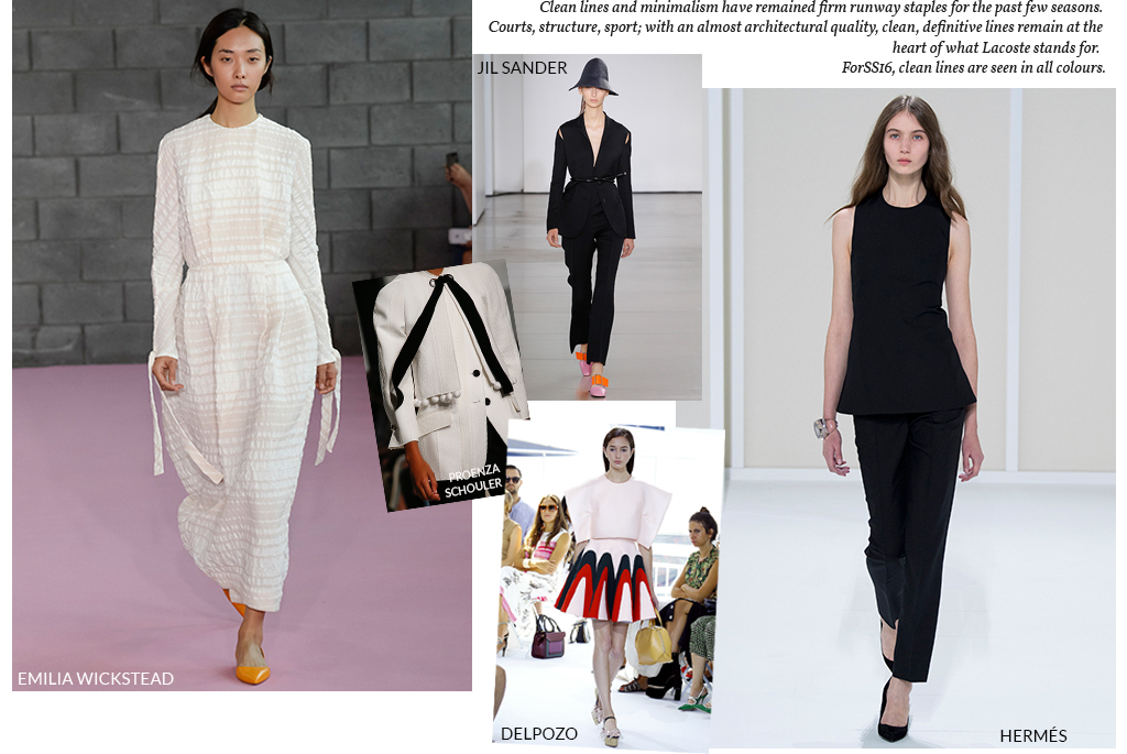 I have teamed up with Lacoste this season to bring you the best of SS16, from NYC, London, Milan and Paris. I remember my very first crush in secondary school used to wear this mint green Lacoste polo shirt that always smelled of his body spray, making me swoon approximately seven times an hour. Just like that, the embroidered crocodile came to be the emblem of young love. Years later, I still have a fondness for this little crocodile, although now he is a much more elusive creature in Felipe Oliveira Baptista’s directional world. The Lacoste SS16 collection was infused with Olympic references, obviously justified as the label is once again outfitting the French Olympic delegation for the Opening Ceremony in Rio in 2016. And while there wasn’t a polo-shirt in sight, there were common themes during the show that were carried throughout all four fashion week locations: net, punched, clean lines, piqué and monochrome. These are and have been Lacoste’s core values since its inception.